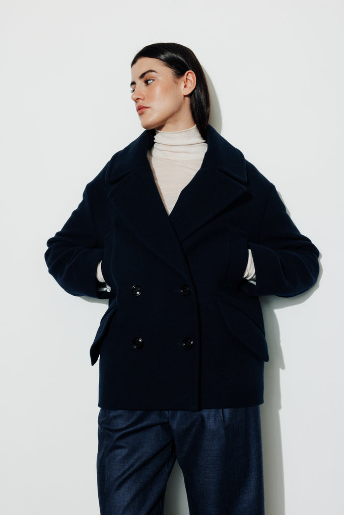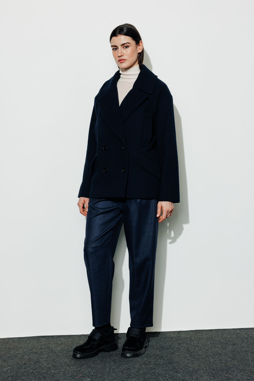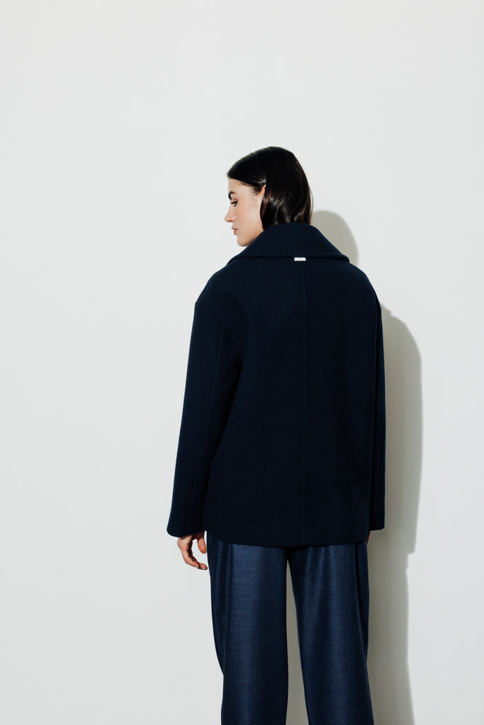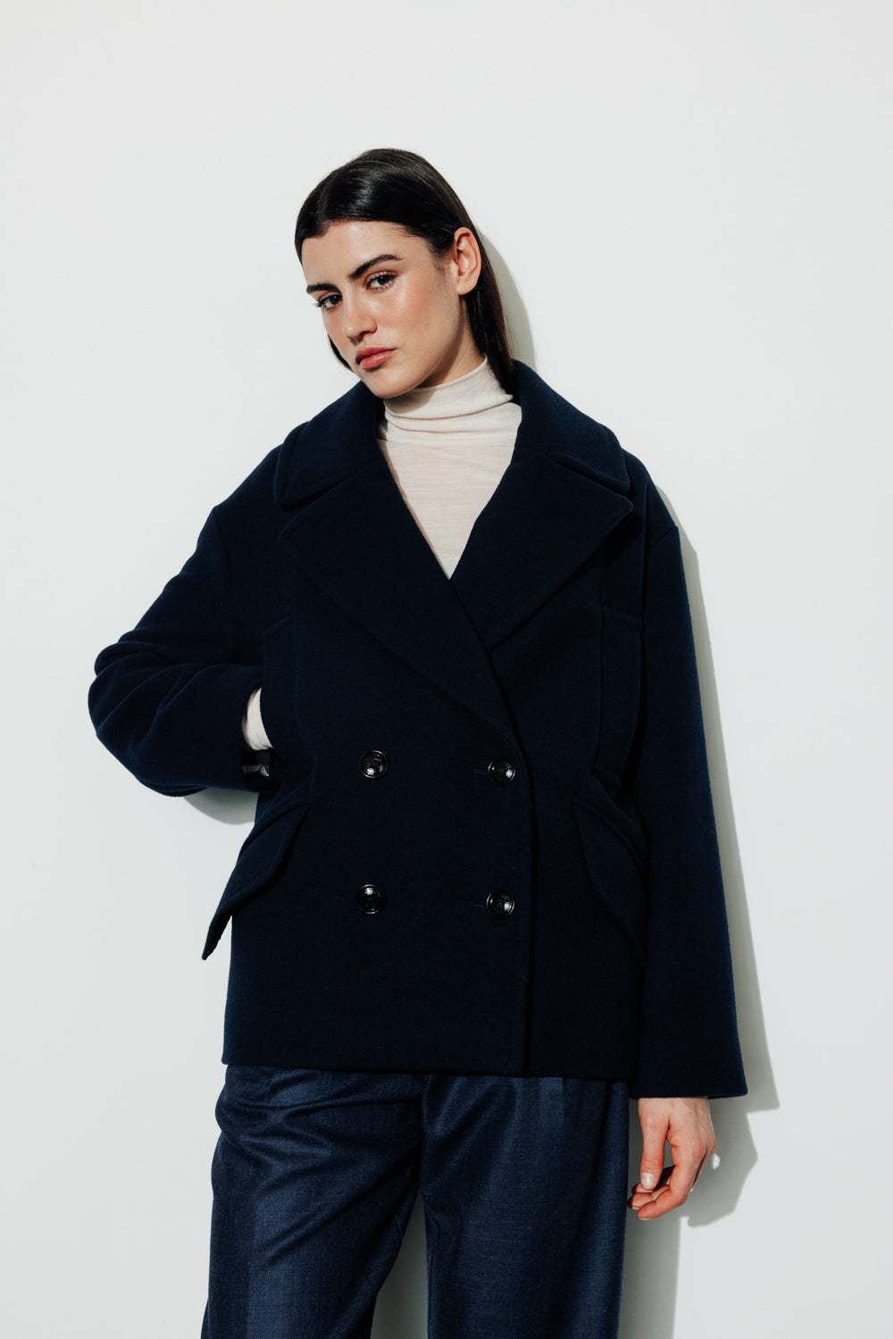 Manteau court oversize Col tailleur Demi pied de col contrasté Double boutonnage Emmanchure tombante Poches raglans poitrine Poches passepoilées avec rabat Modèle doublé
