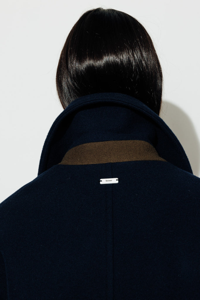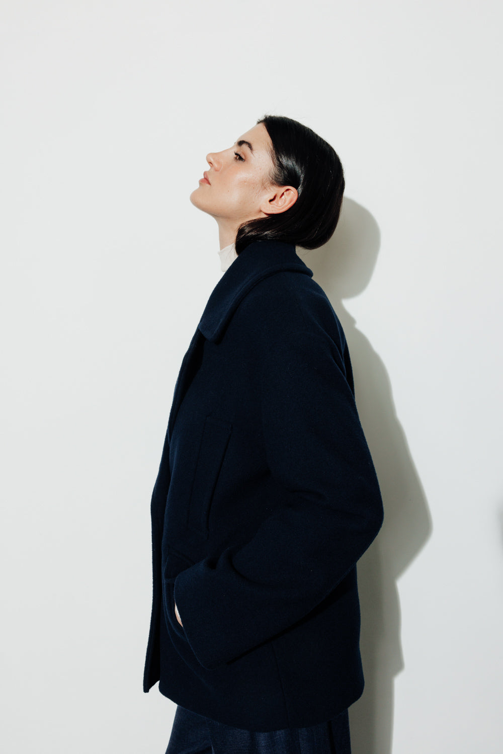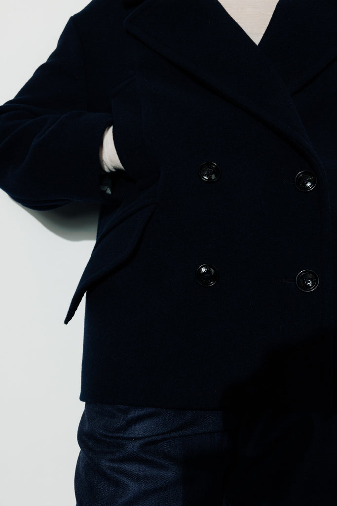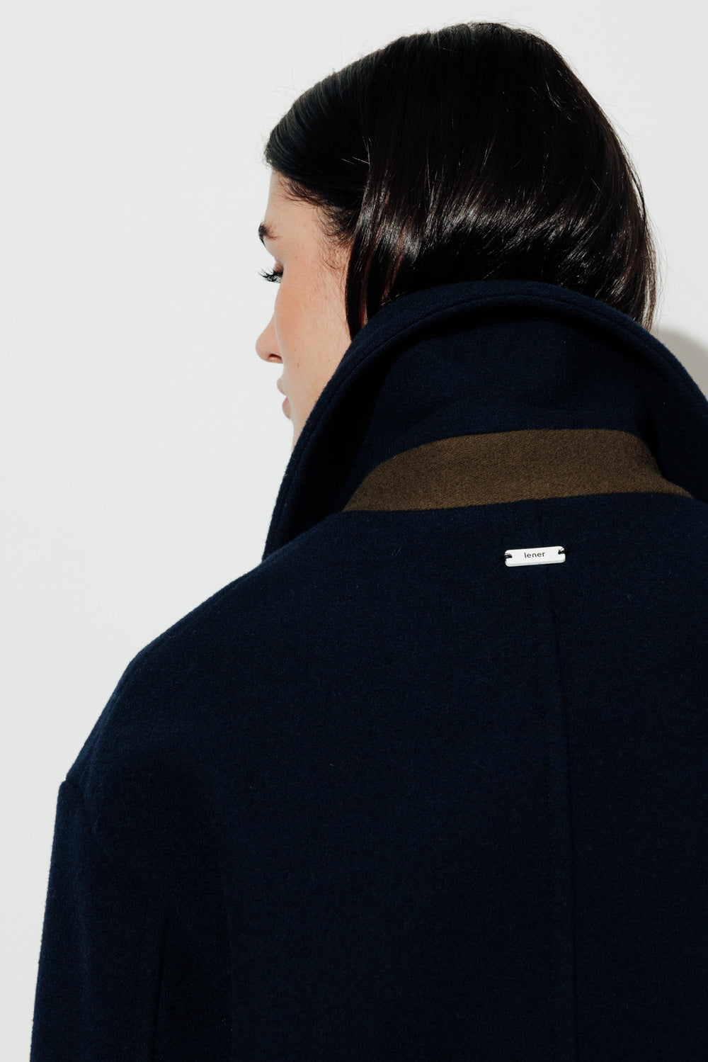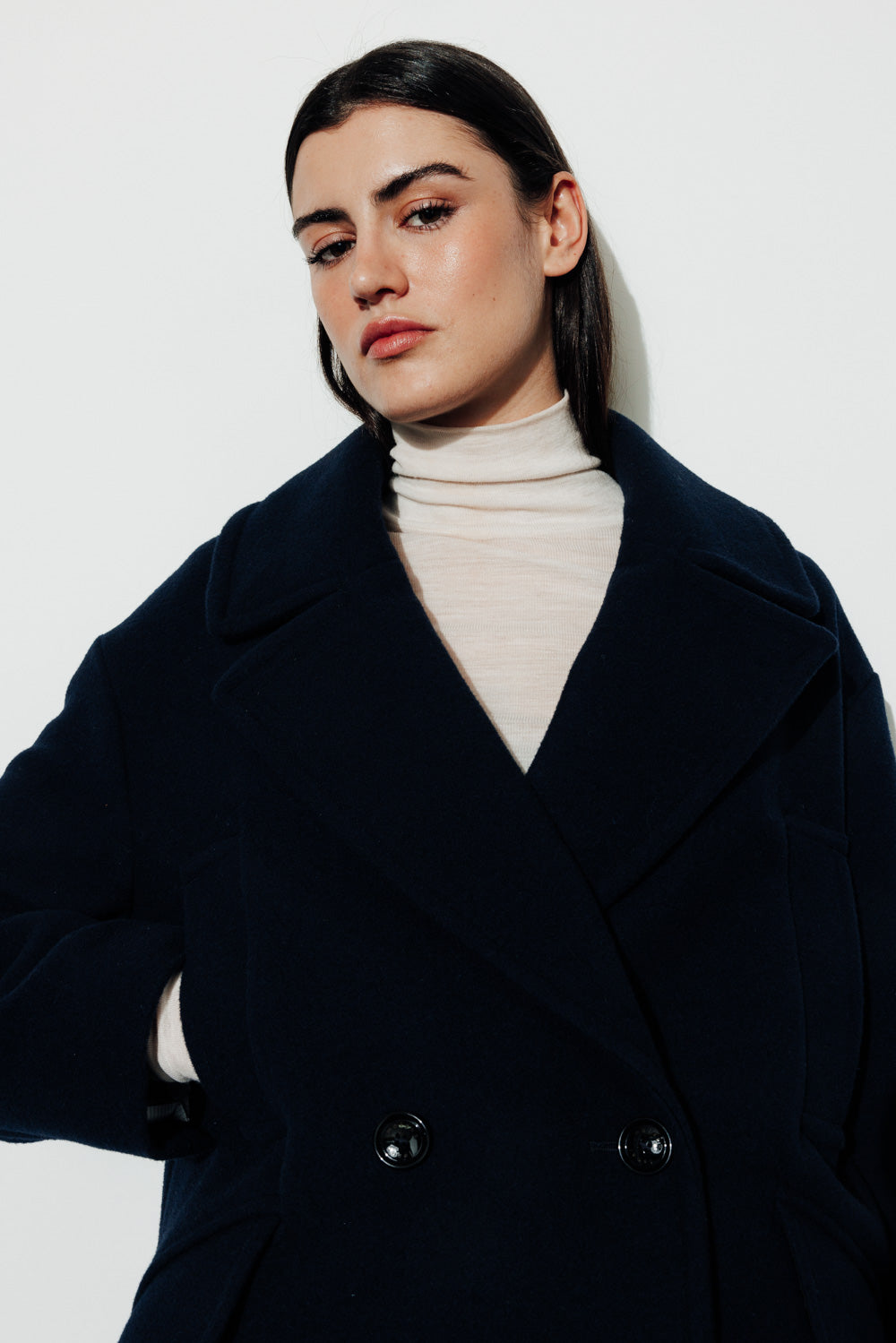 Manteau court oversize Col tailleur Demi pied de col contrasté Double boutonnage Emmanchure tombante Poches raglans poitrine Poches passepoilées avec rabat Modèle doublé