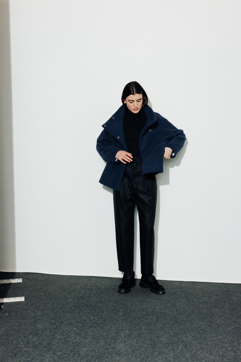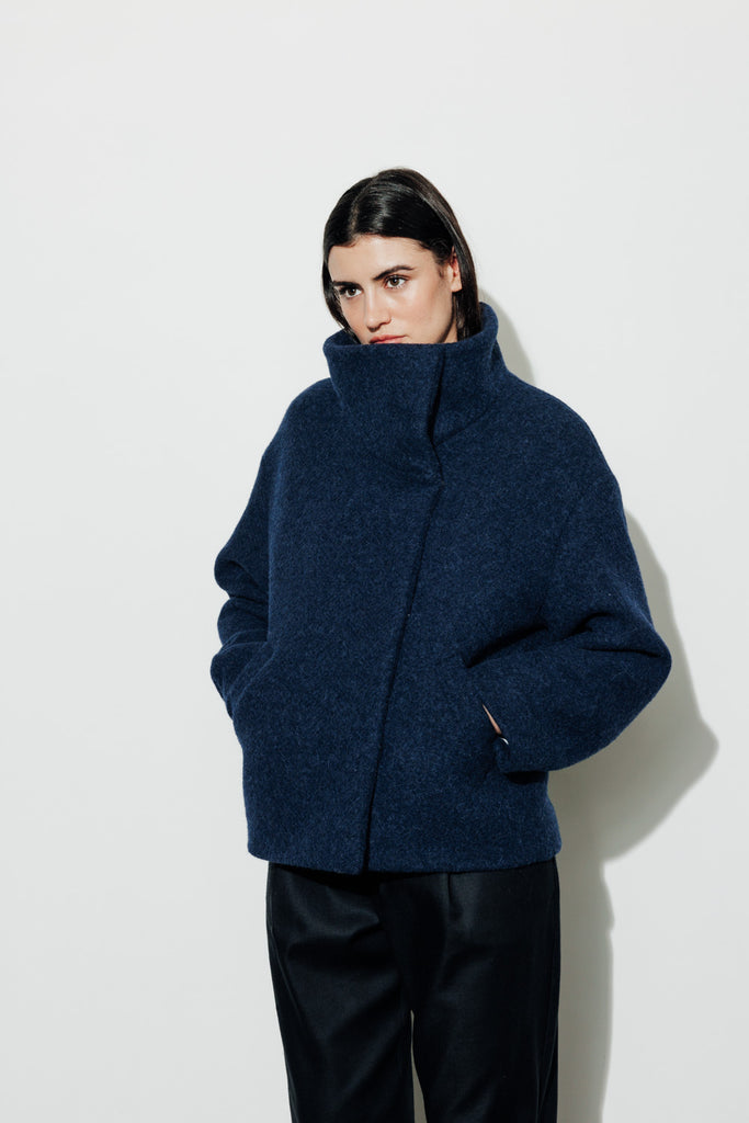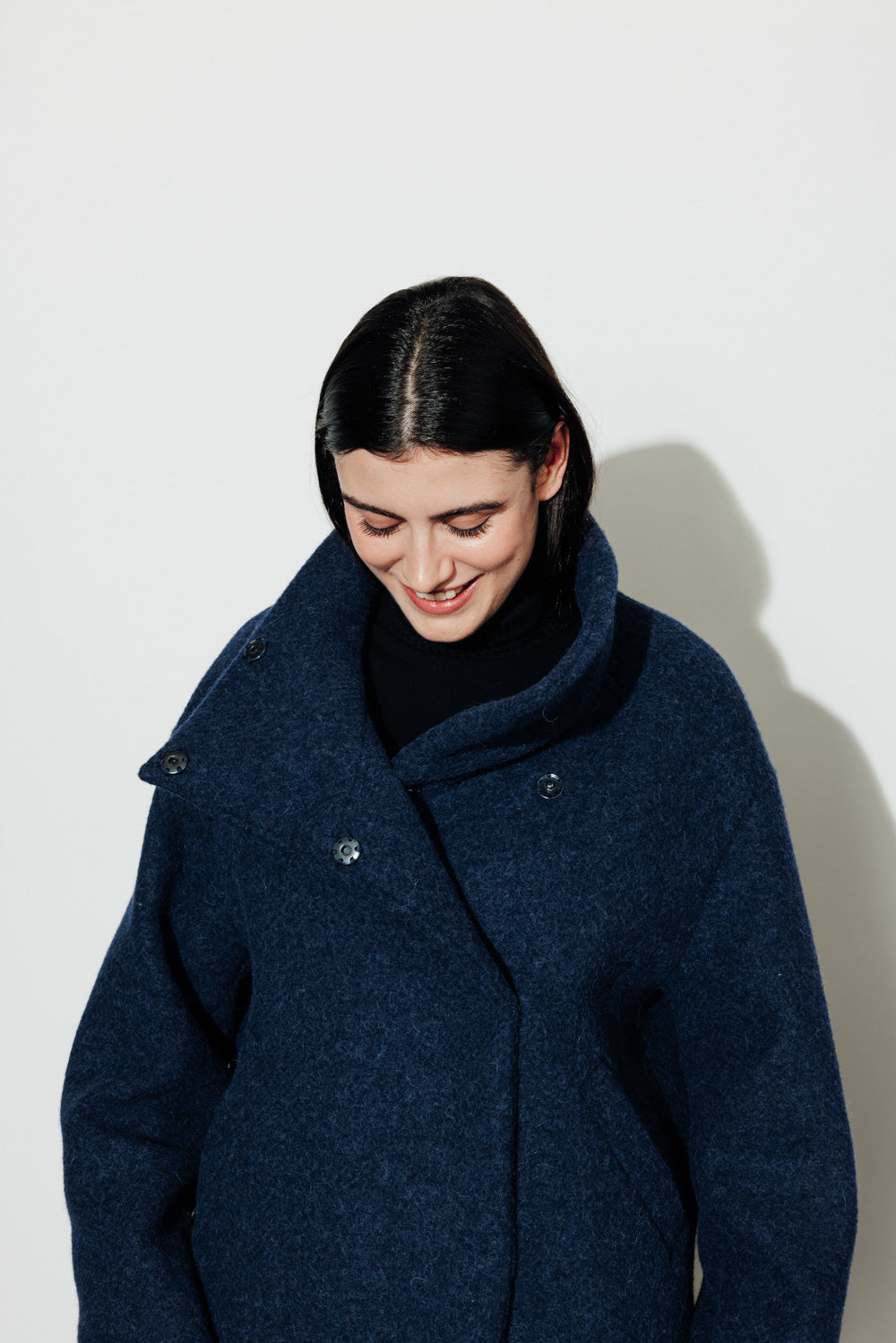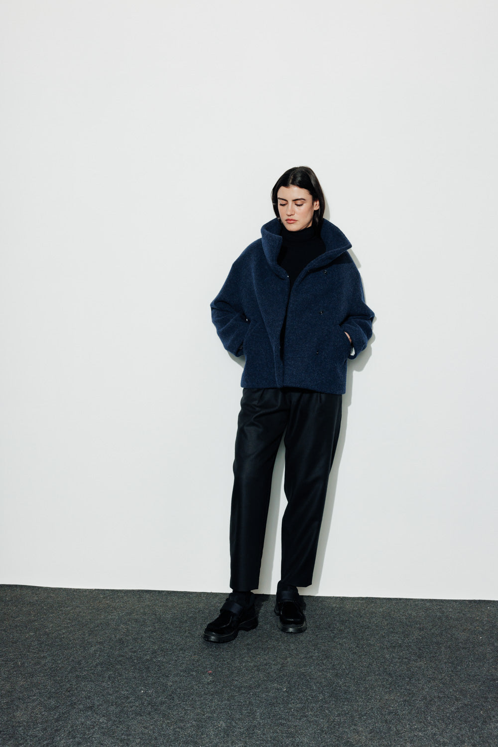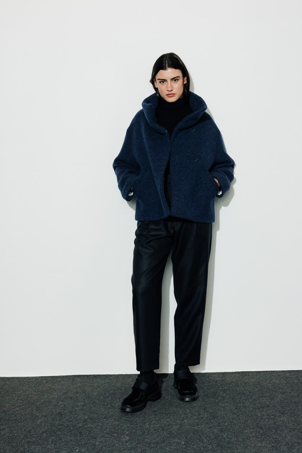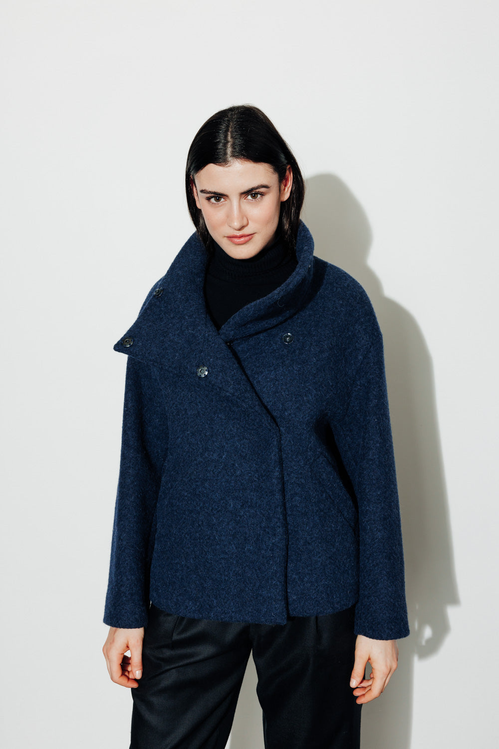 Manteau court oversize Col montant avec pressions invisibles cousues Fermeture double boutonnage avec pressions invisibles cousues Emmanchure tombante Poches passepoilées Modèle doublé