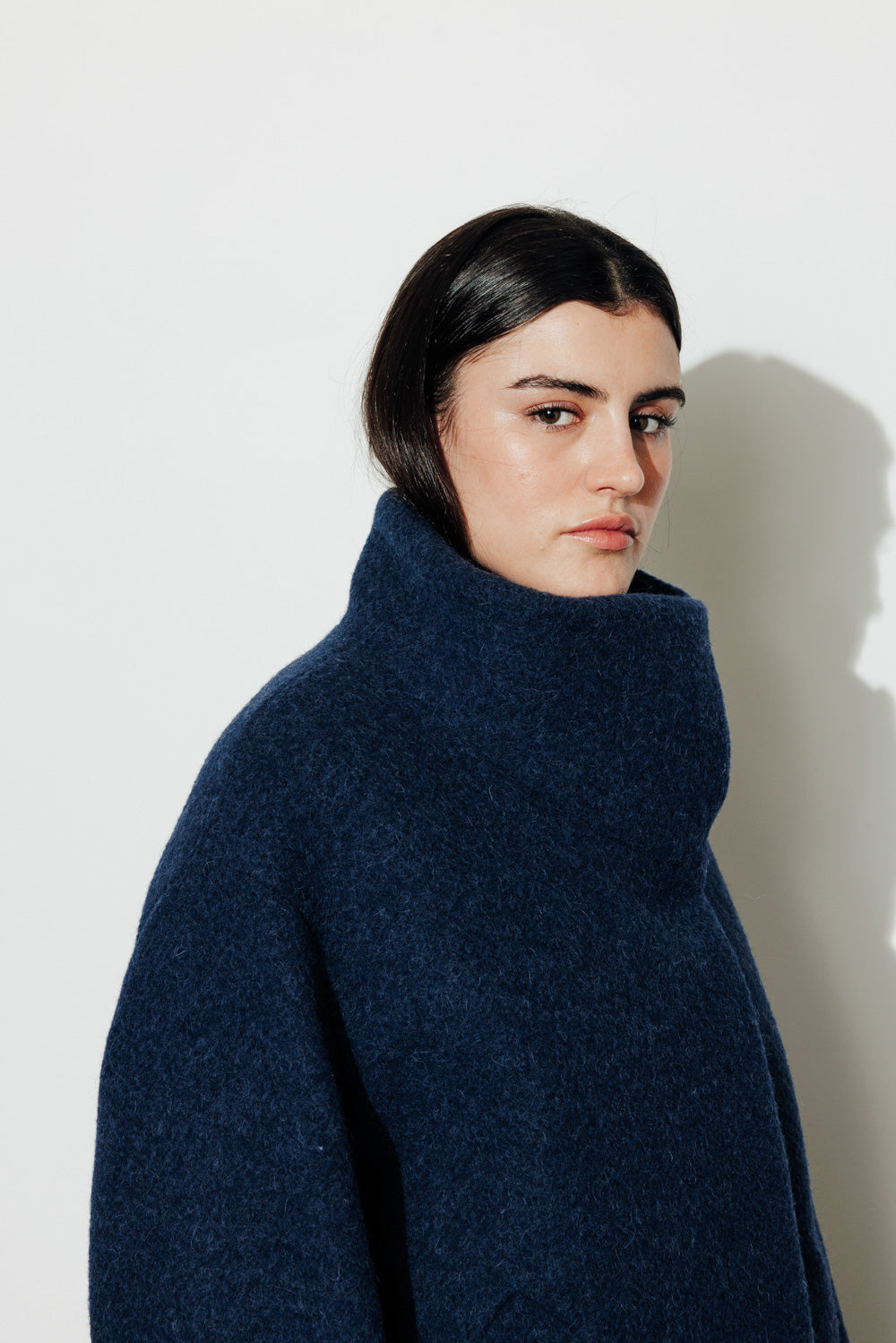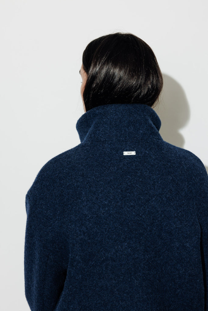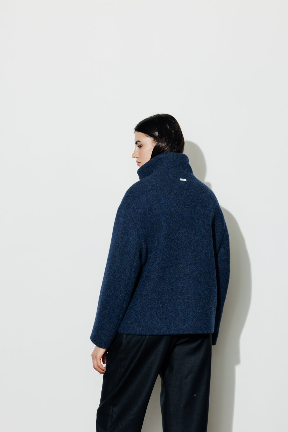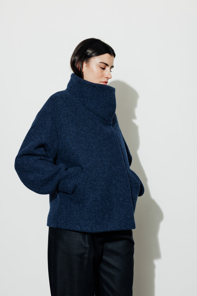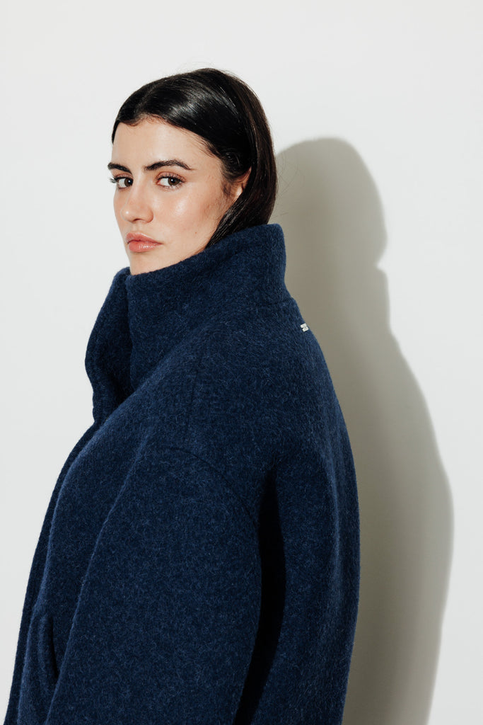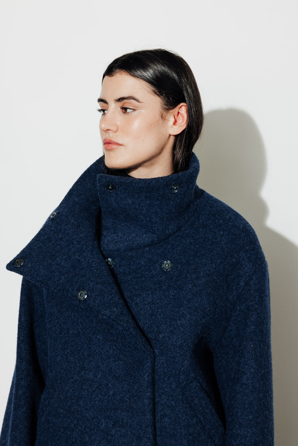 Manteau court oversize Col montant avec pressions invisibles cousues Fermeture double boutonnage avec pressions invisibles cousues Emmanchure tombante Poches passepoilées Modèle doublé