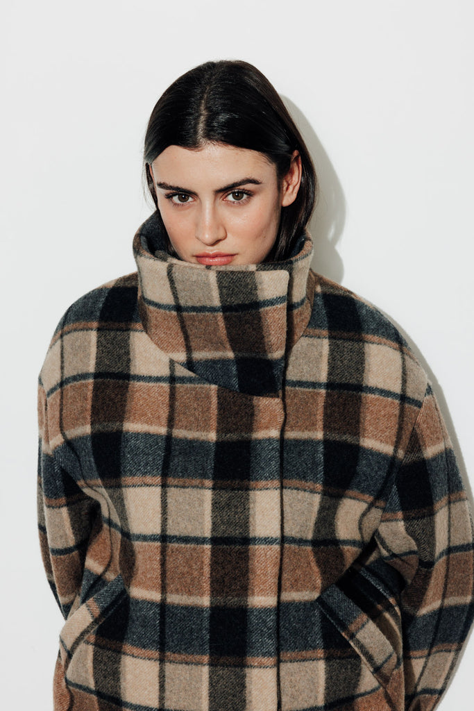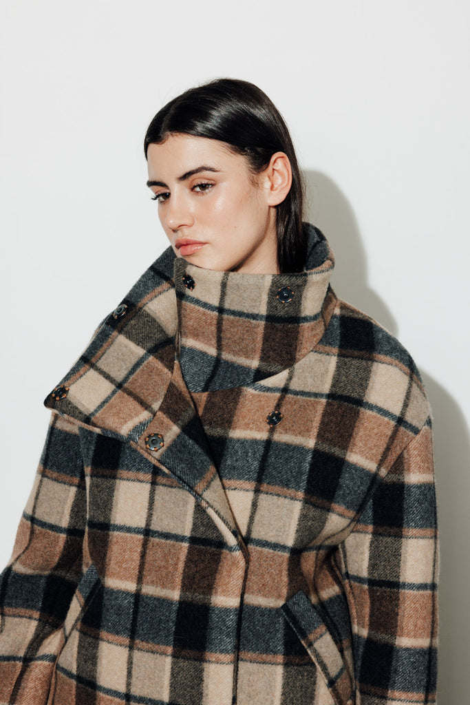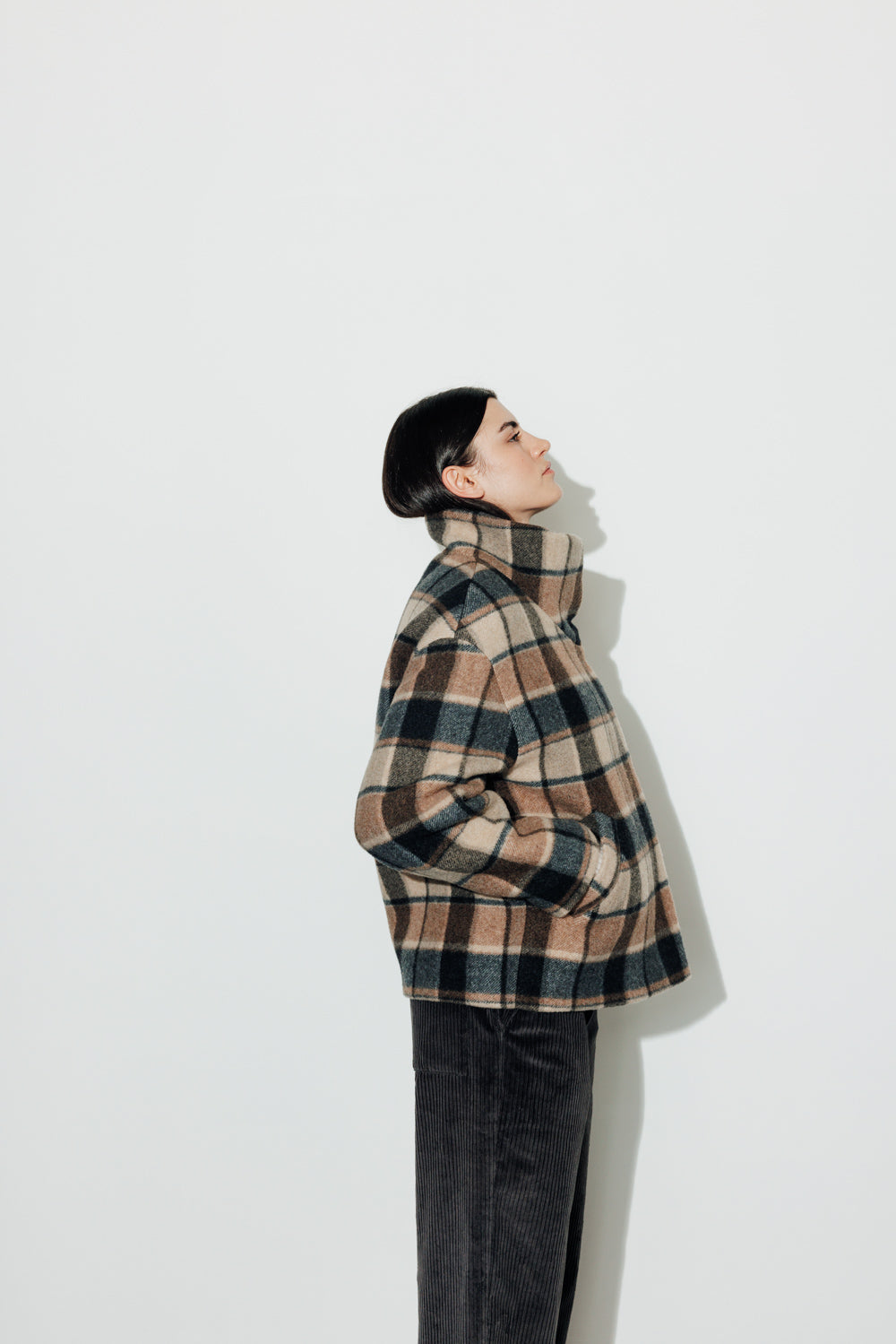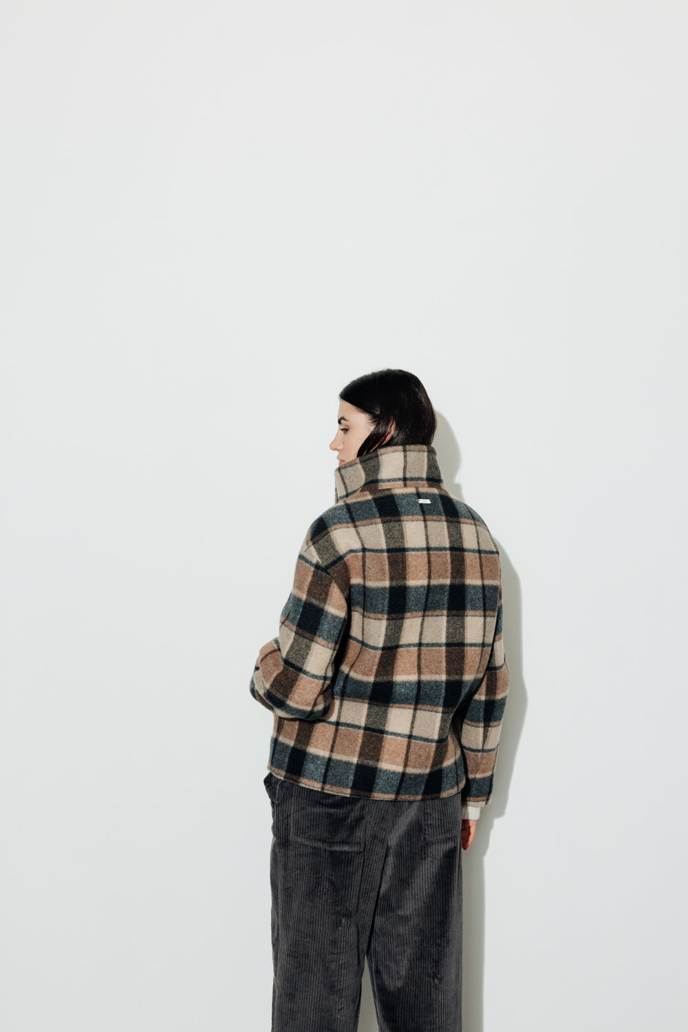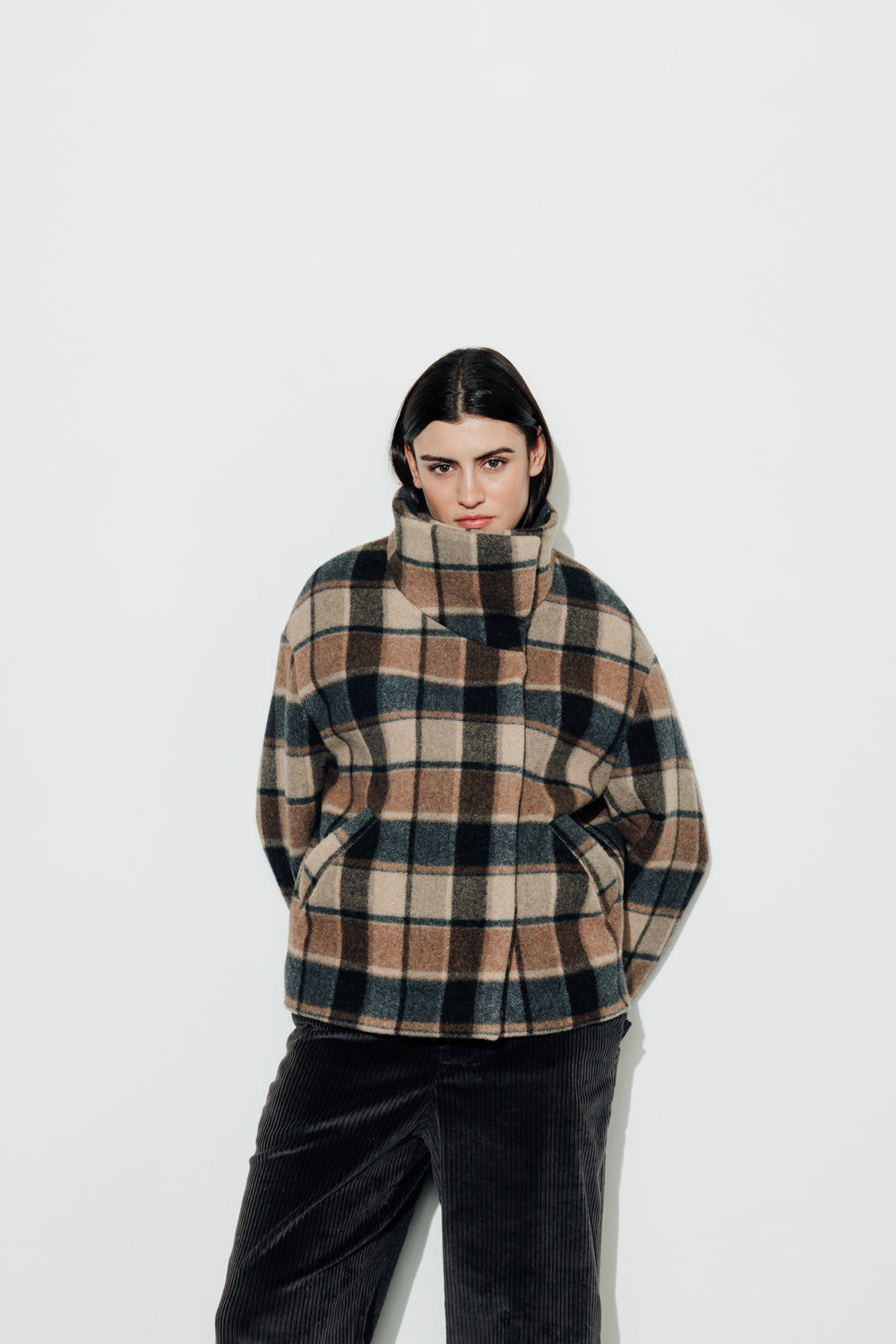 Manteau court oversize Col montant avec pressions invisibles cousues Fermeture double boutonnage avec pressions invisibles cousues Emmanchure tombante Poches passepoilées Modèle doublé